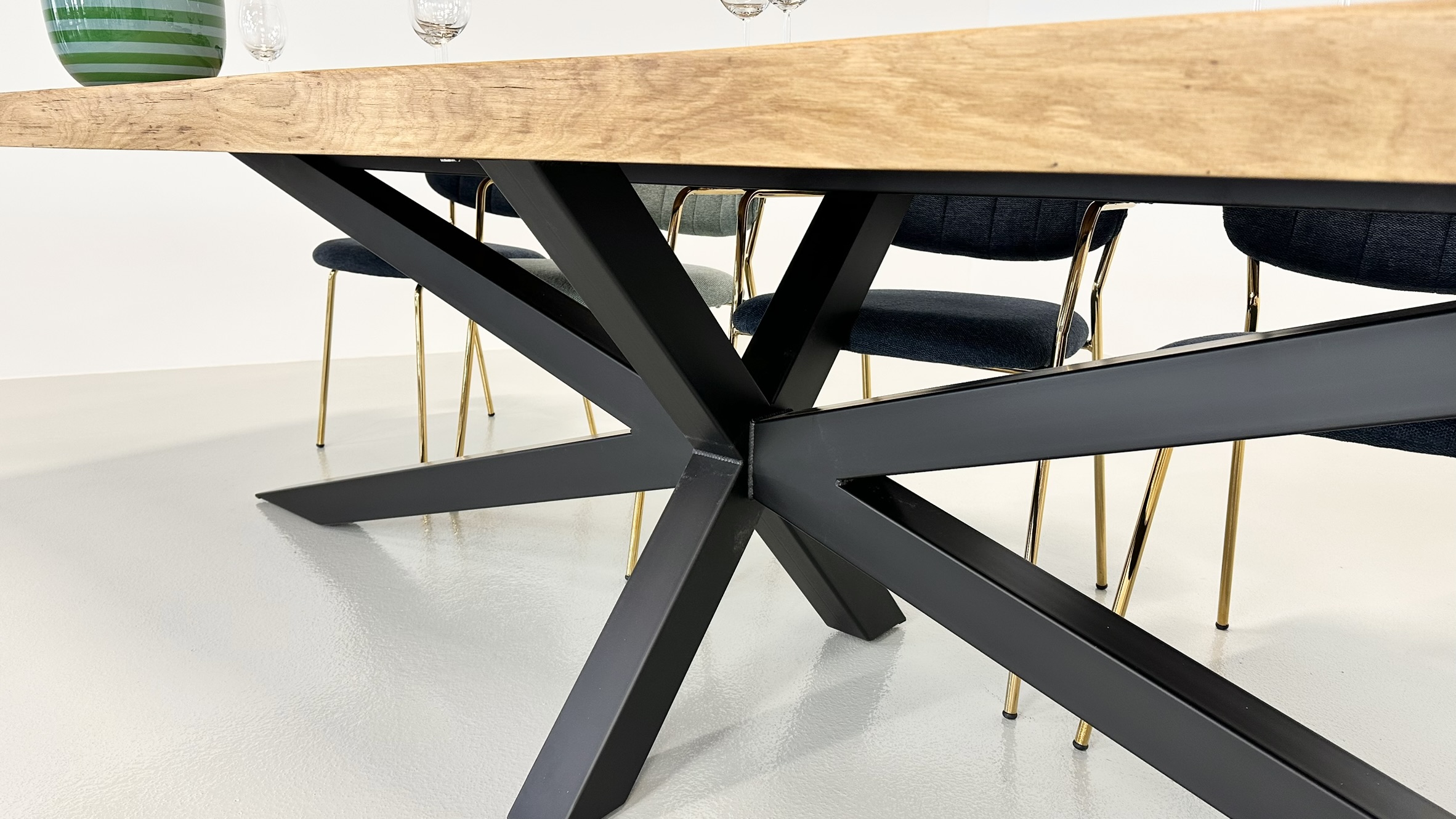 Stellet er designet i 8×8 cm profil dobbelt X-ben i sort pulverlakeret stål.