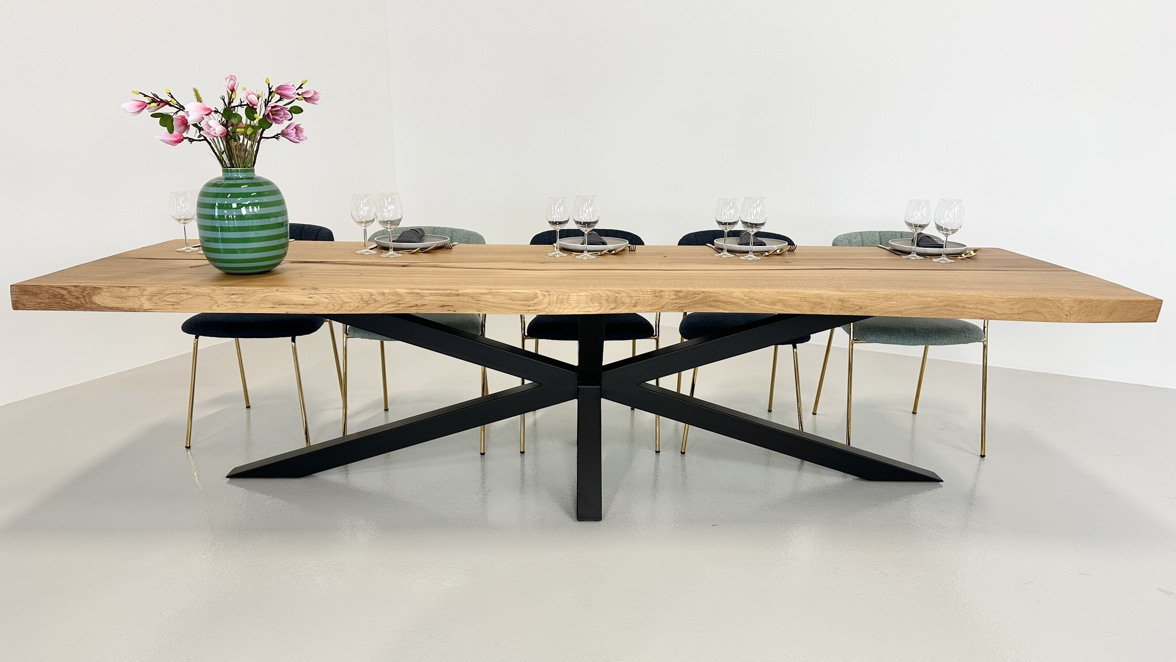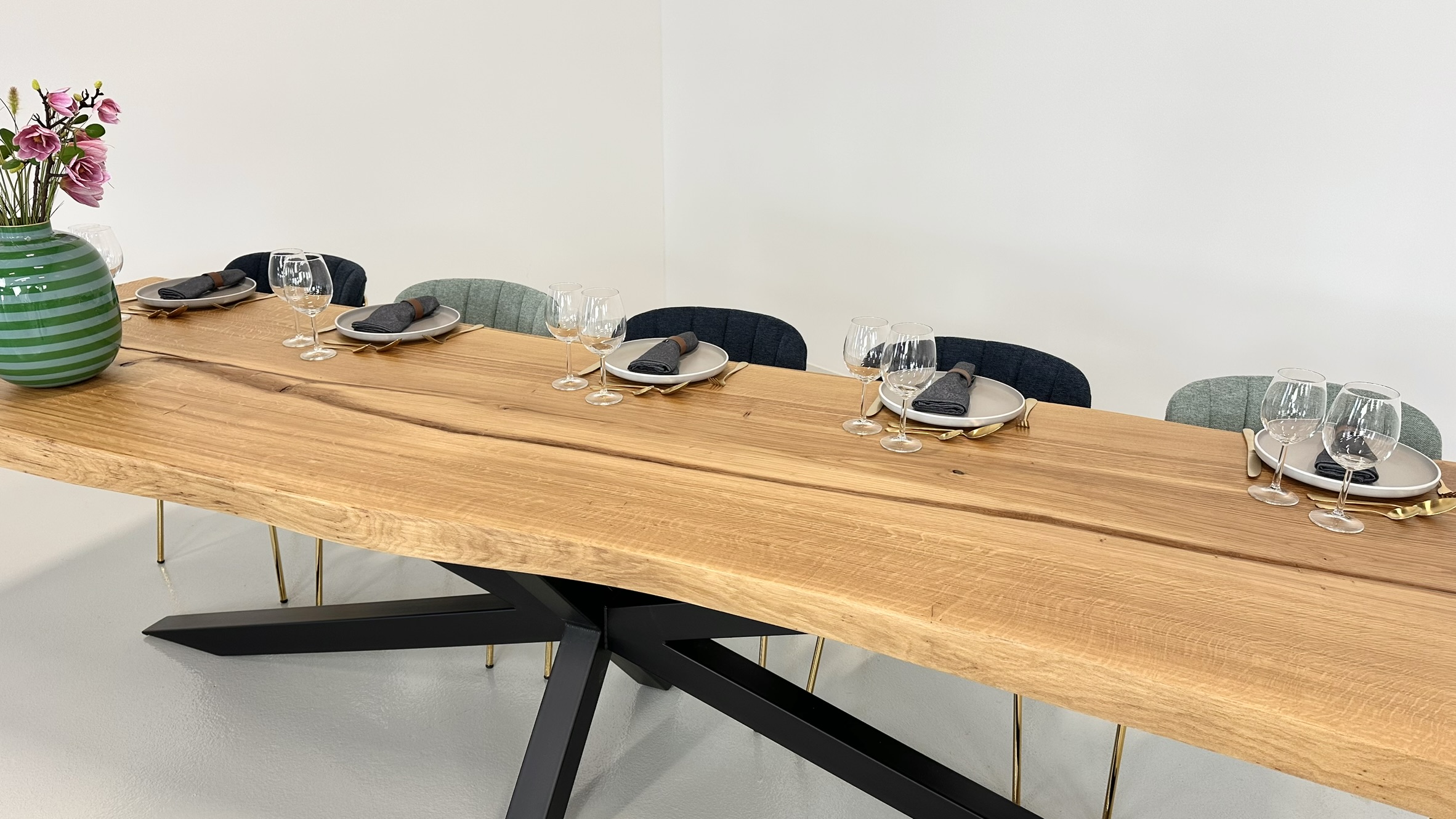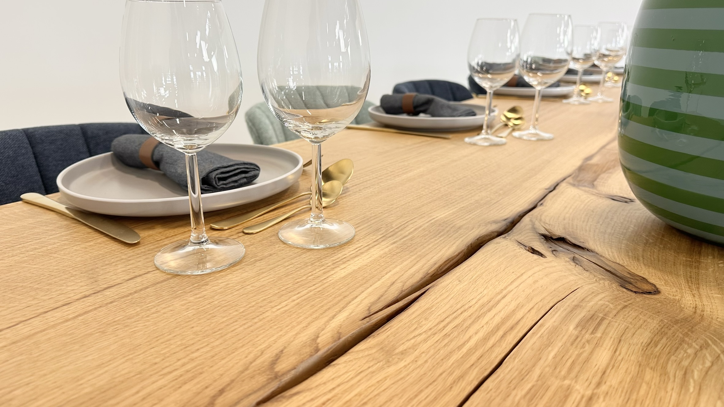 Dette gigantiske bord er skabt af én enkelt ovntørret egetræsplanke og udstråler en sjælden elegance, der fanger enhver opmærksomhed.