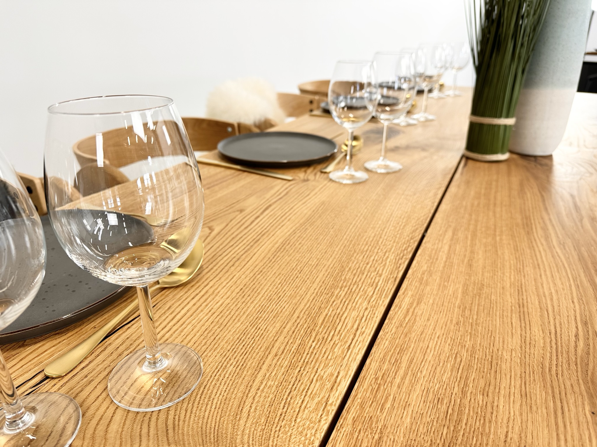 Bordet er håndlavet af kvalitetsmaterialer og er skabt med en fokus på funktionalitet, holdbarhed og æstetik. Det er lavet af massivt egetræ, der er både stærkt og smukt på samme tid. Egetræet har en smuk kornstruktur, og den naturlige farve og glans gør det til et tidløst og elegant valg til enhver spisestue.