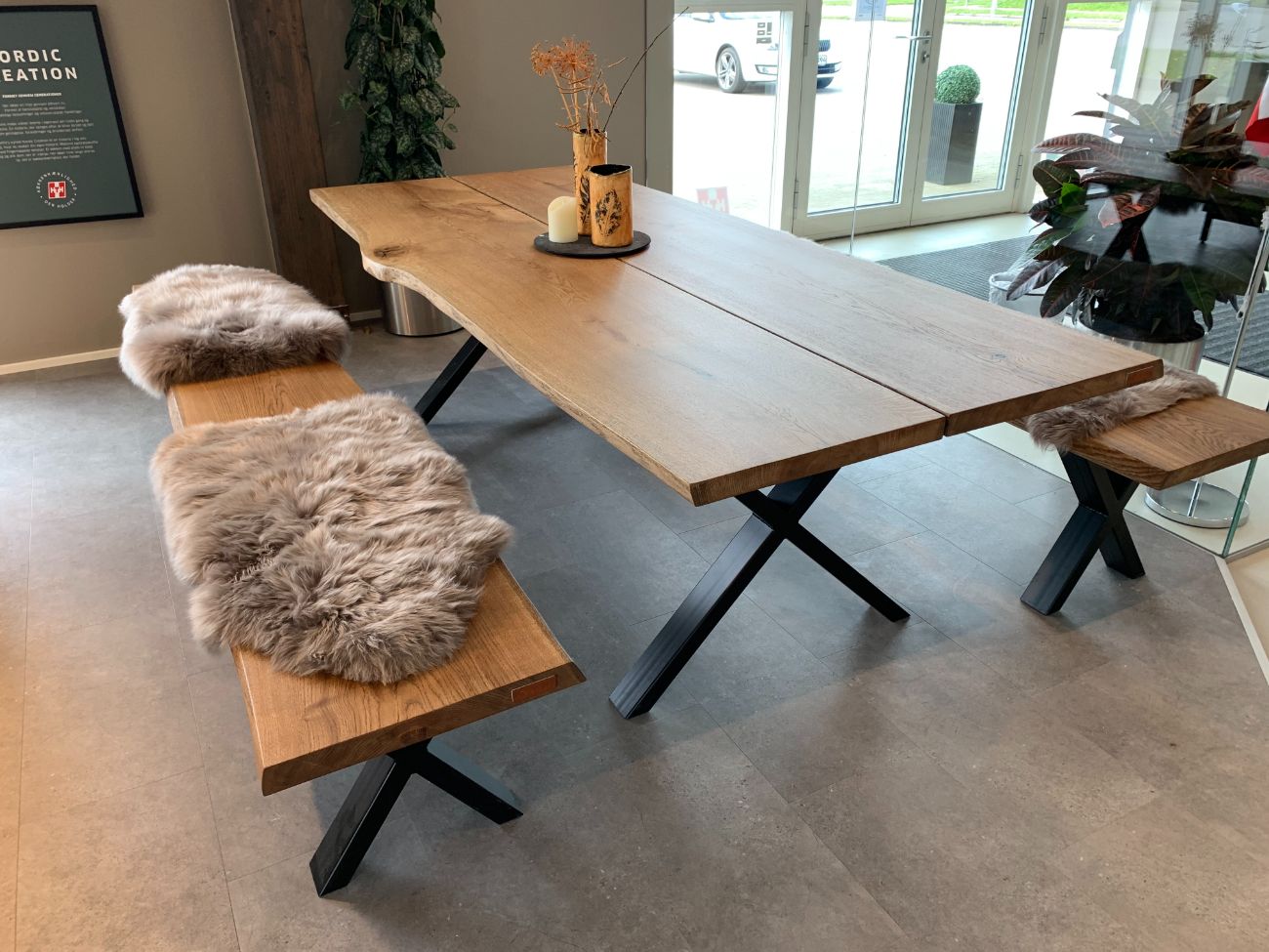Det massive bord er lavet af to store planker af eg, som har en tykkelse på 4,5 cm. Eg er kendt for sin robusthed, samt holdbarhed og giver bordet en naturlig og varm glød. Plankebordet har en elegant og rustik overflade med åretegninger og knaster, der giver det et autentisk og naturligt udseende.