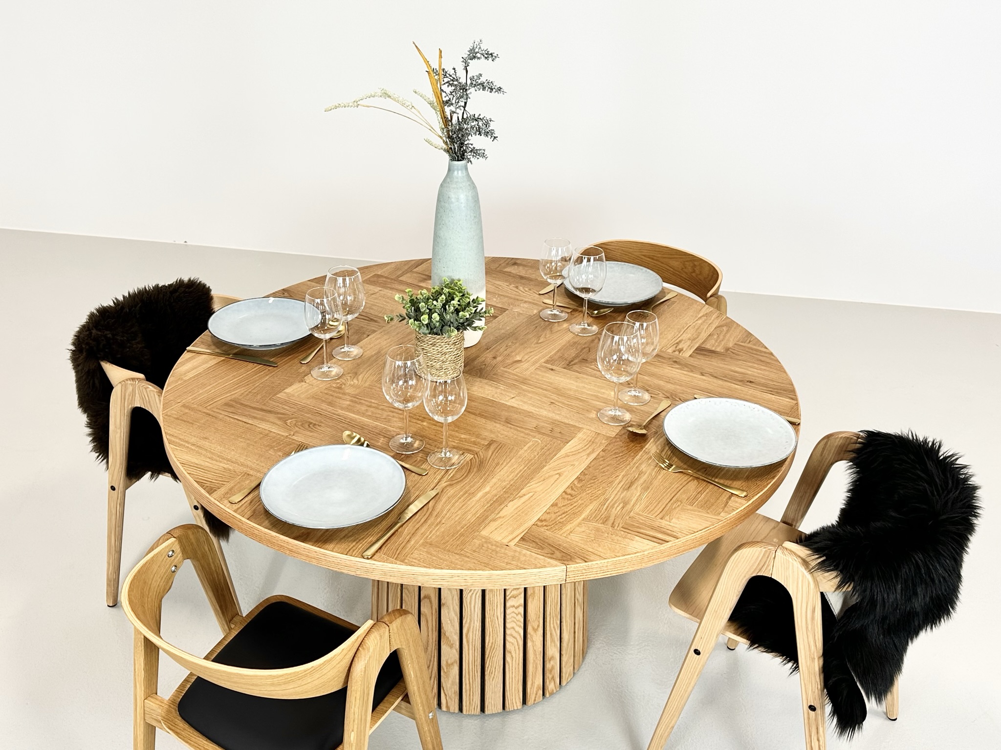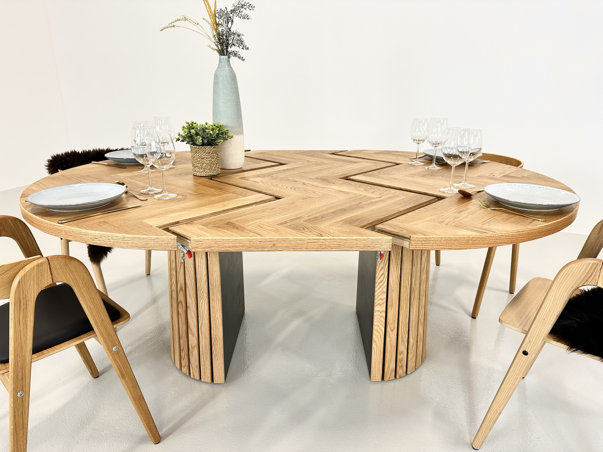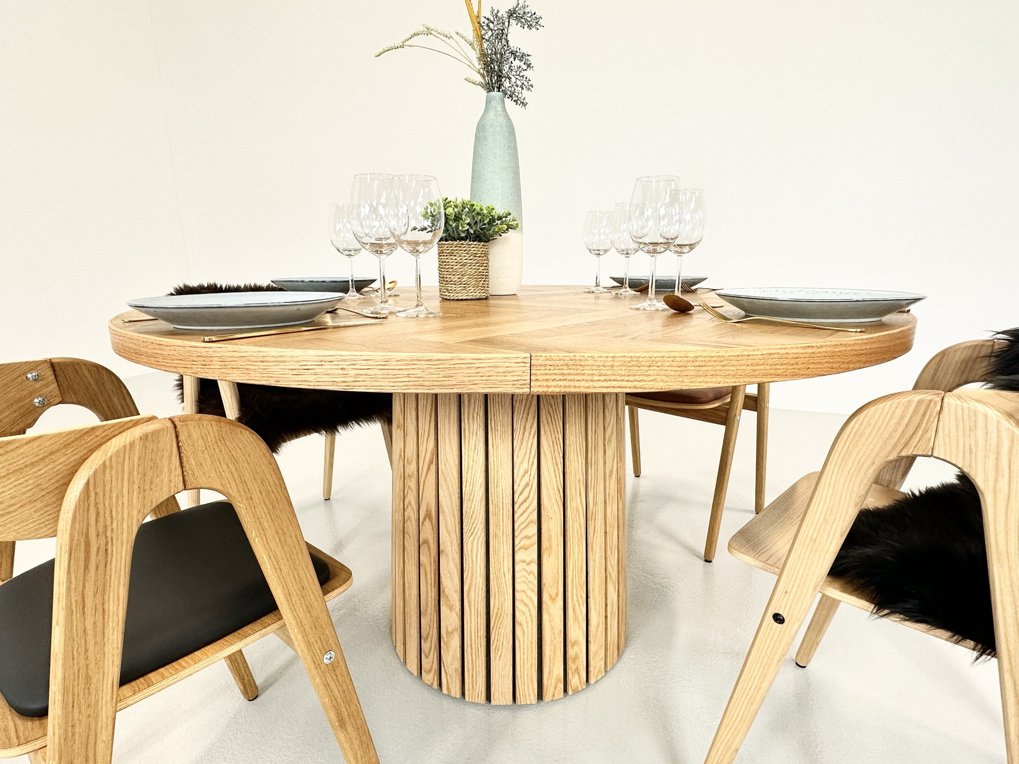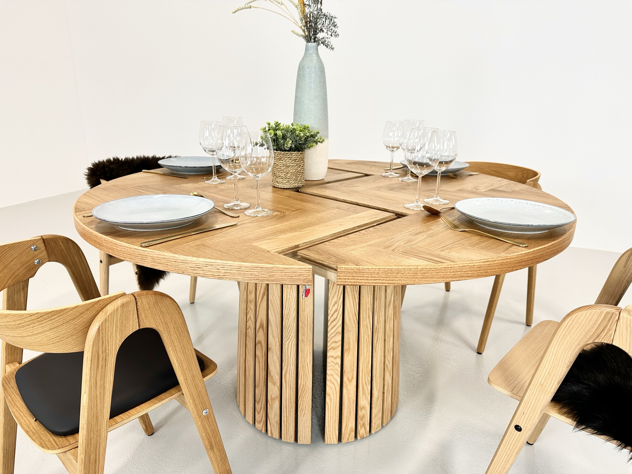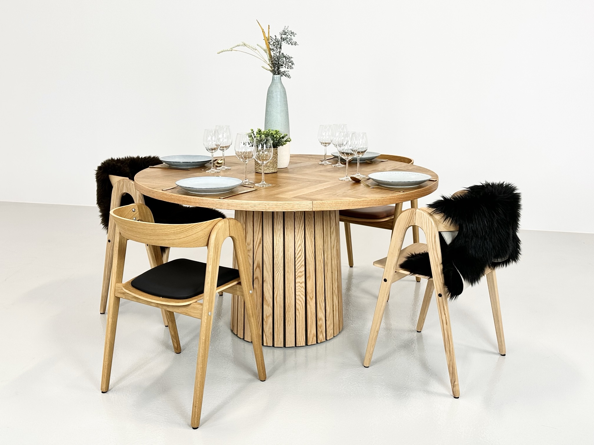 Et rundt fiskebensbord med skjult udtræk til tillægsplader er den perfekte kombination af æstetik, funktionalitet og fleksibilitet, der løfter ethvert rum til nye højder af elegance og praktisk anvendelighed.