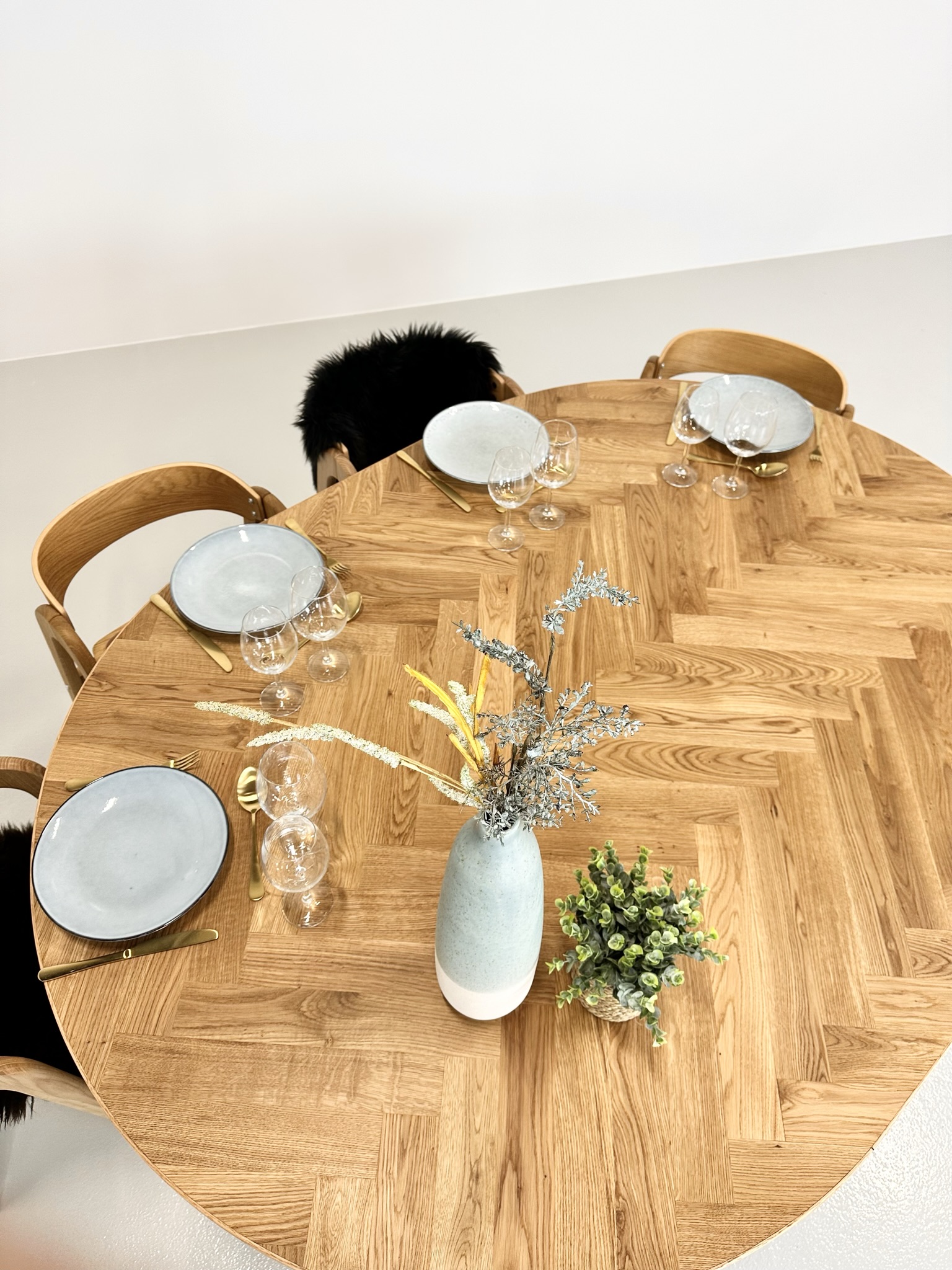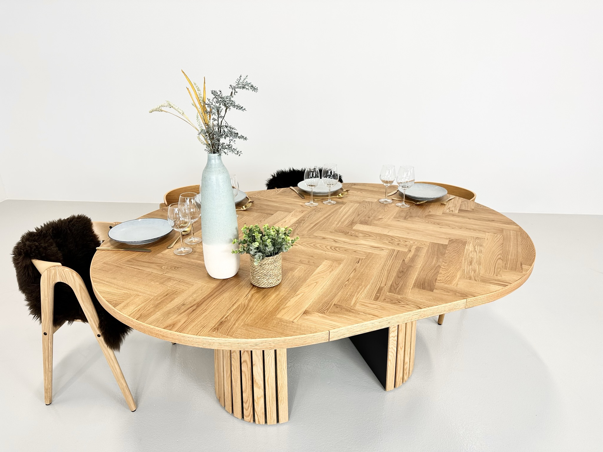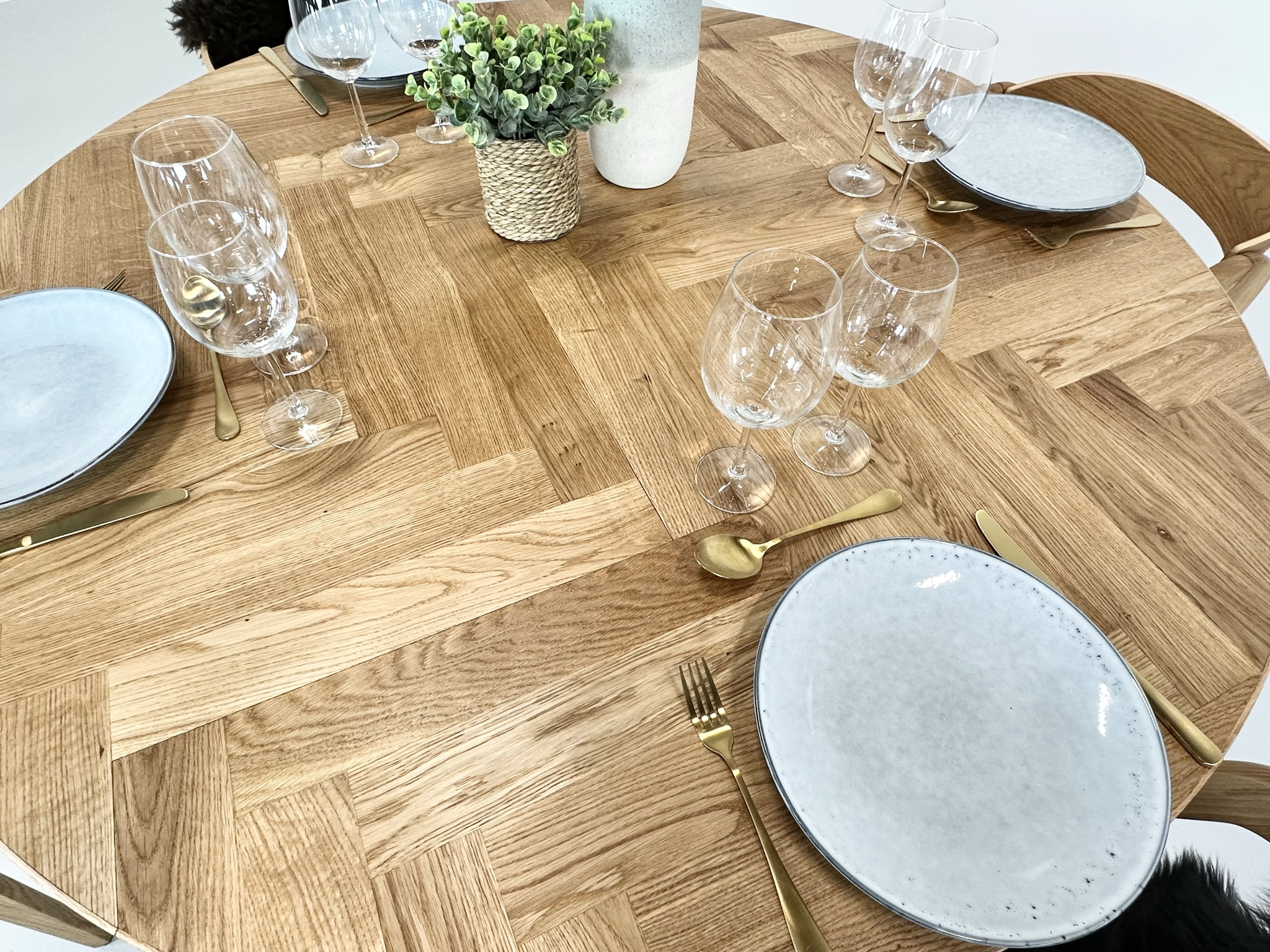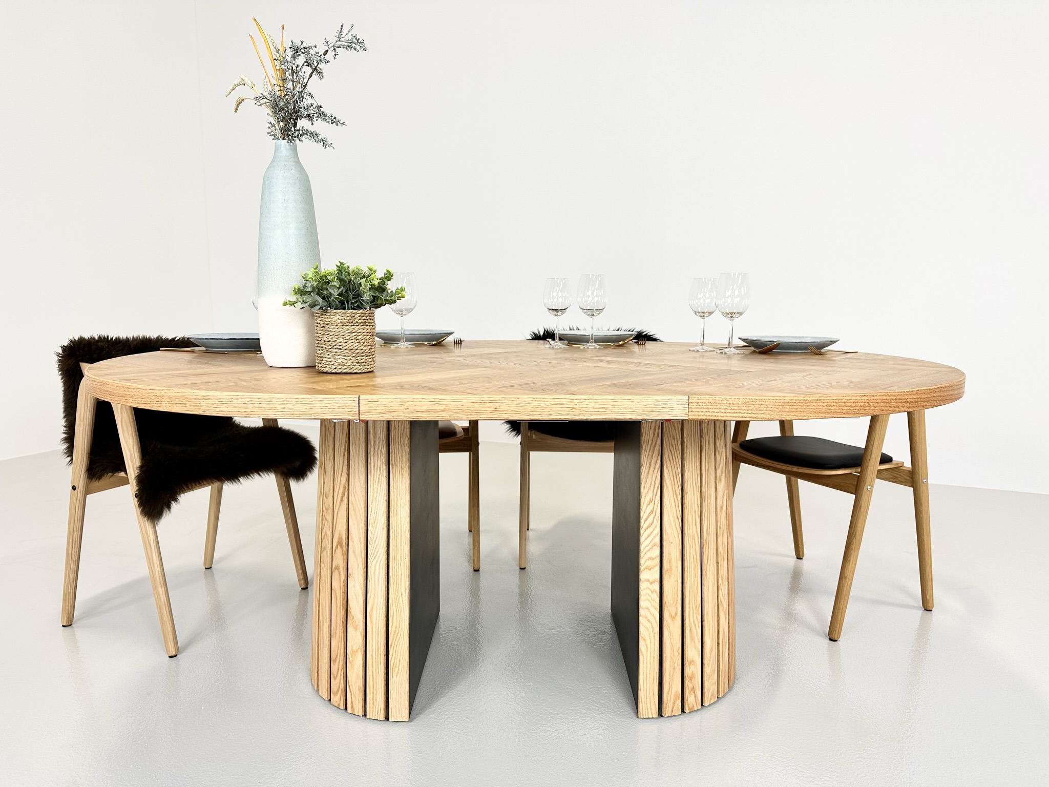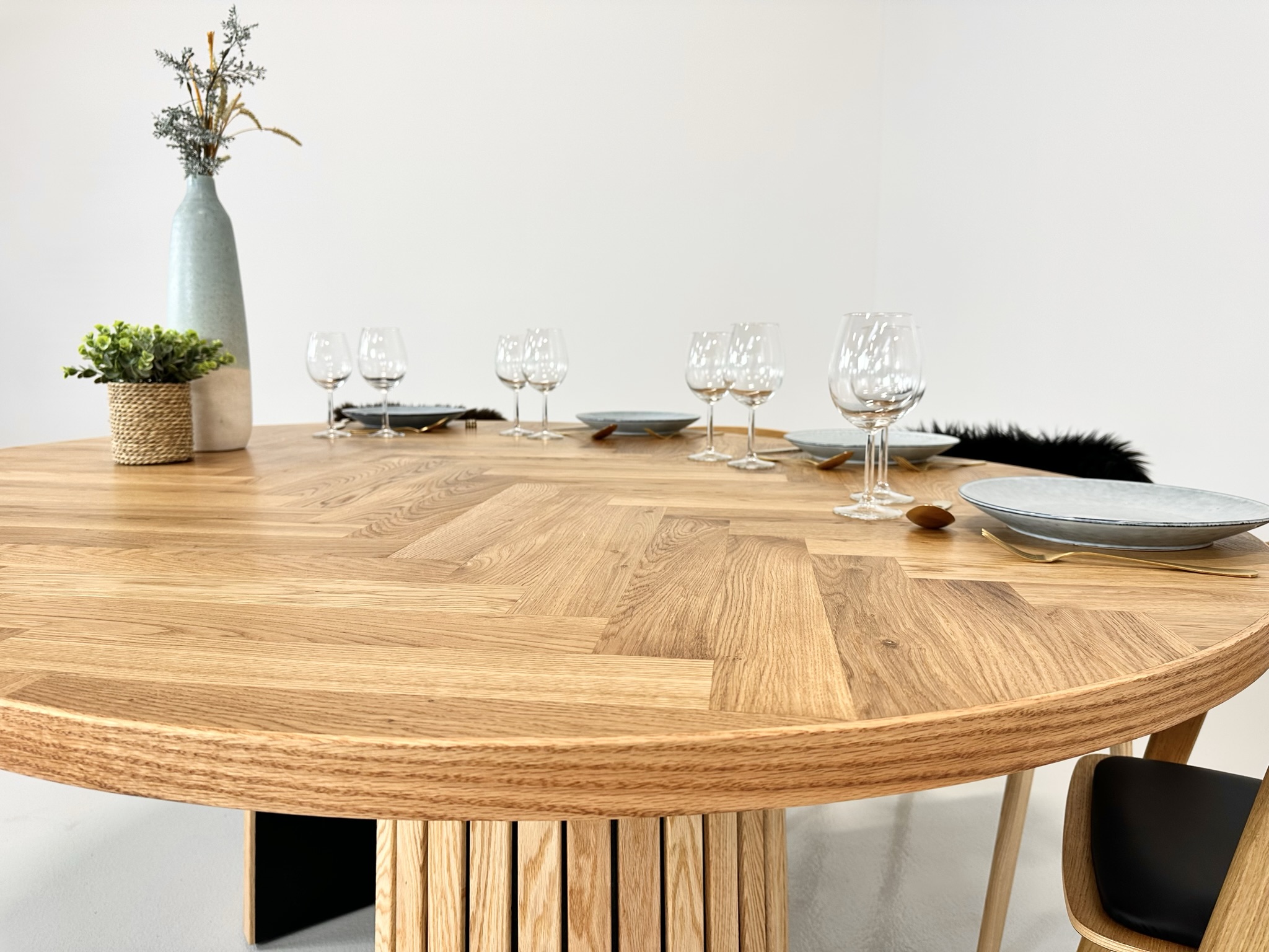 Et rundt fiskebensbord med skjult udtræk til tillægsplader er den perfekte kombination af æstetik, funktionalitet og fleksibilitet, der løfter ethvert rum til nye højder af elegance og praktisk anvendelighed.