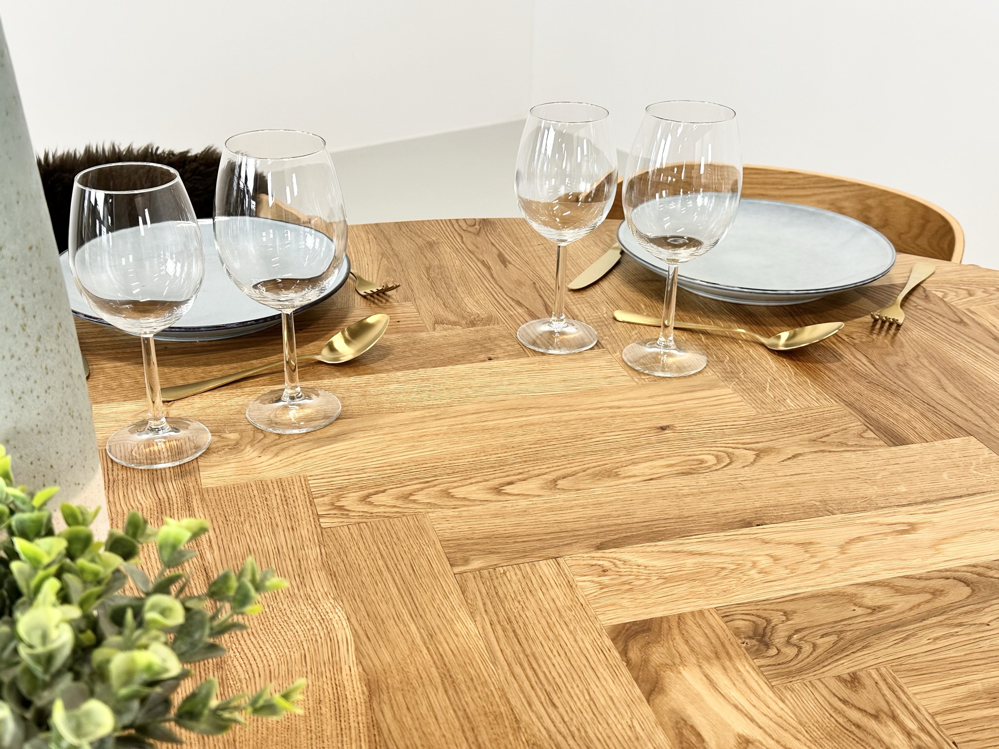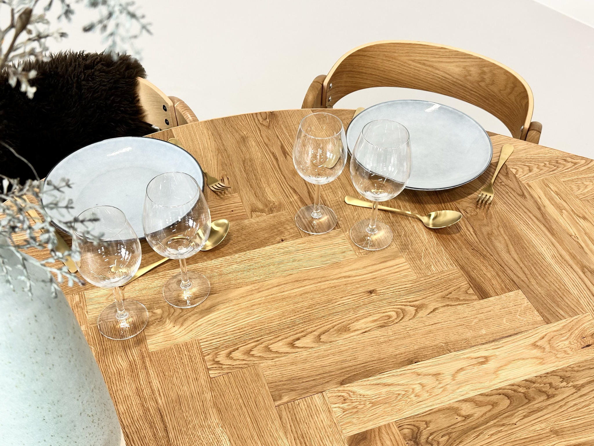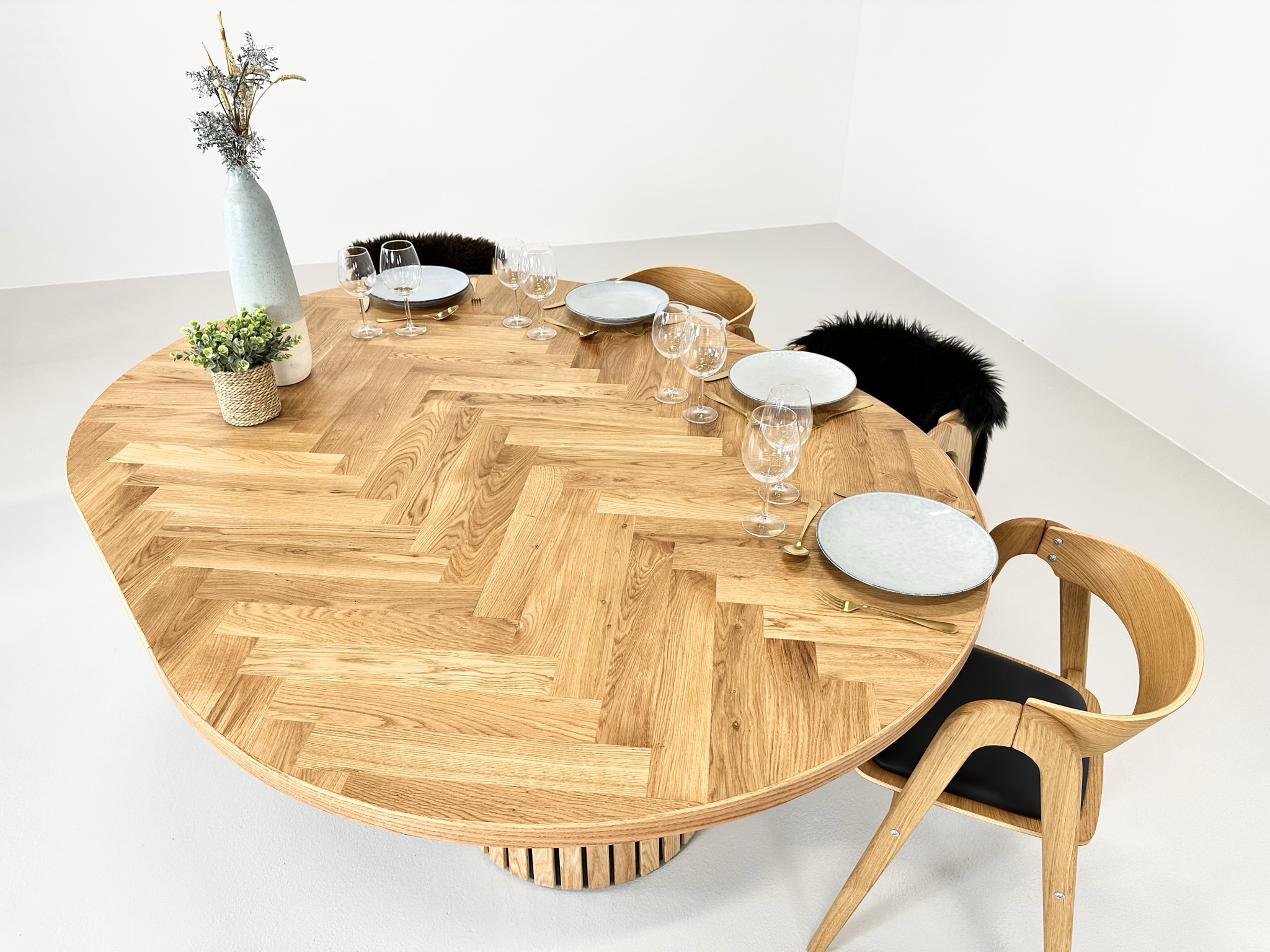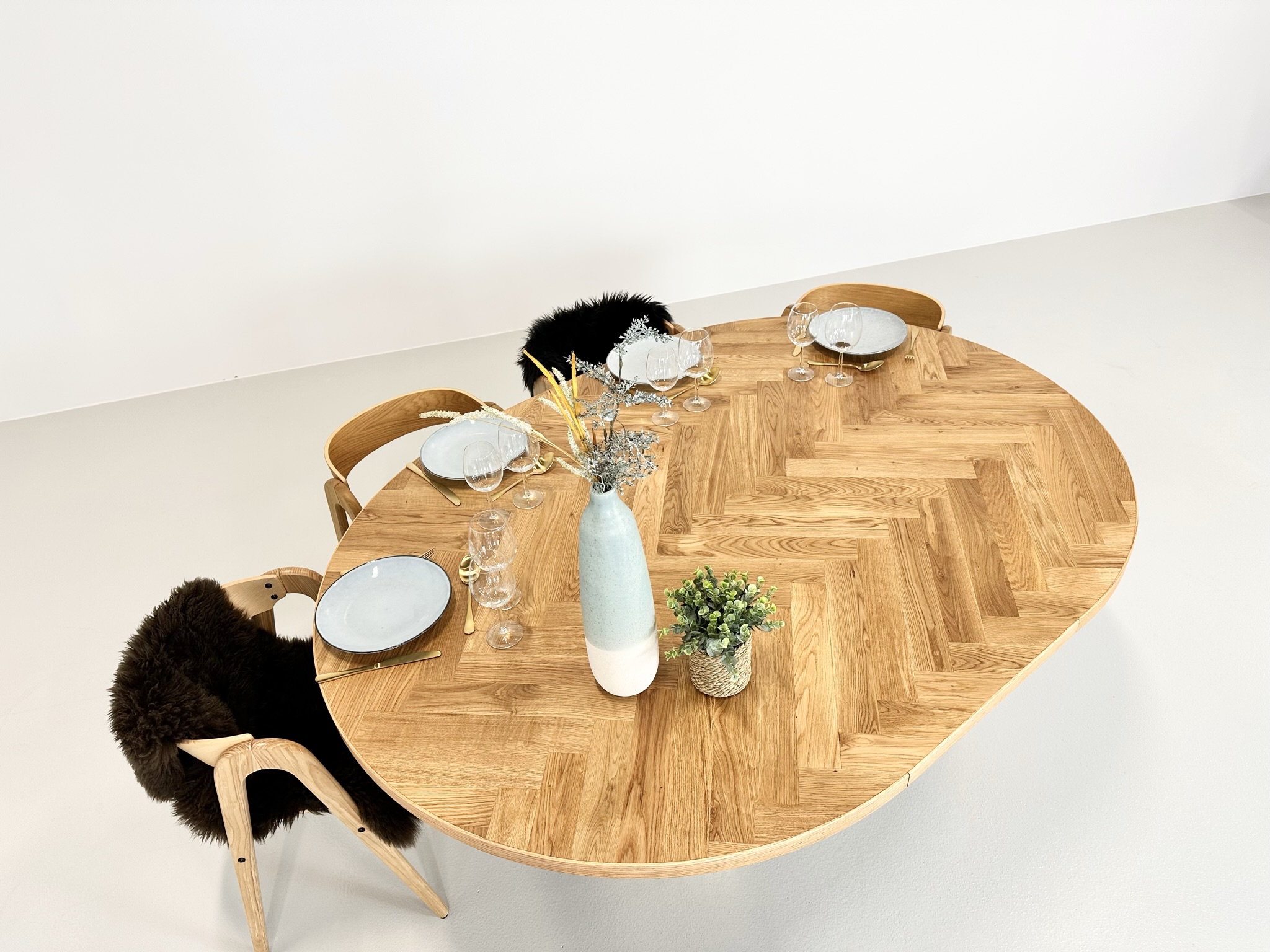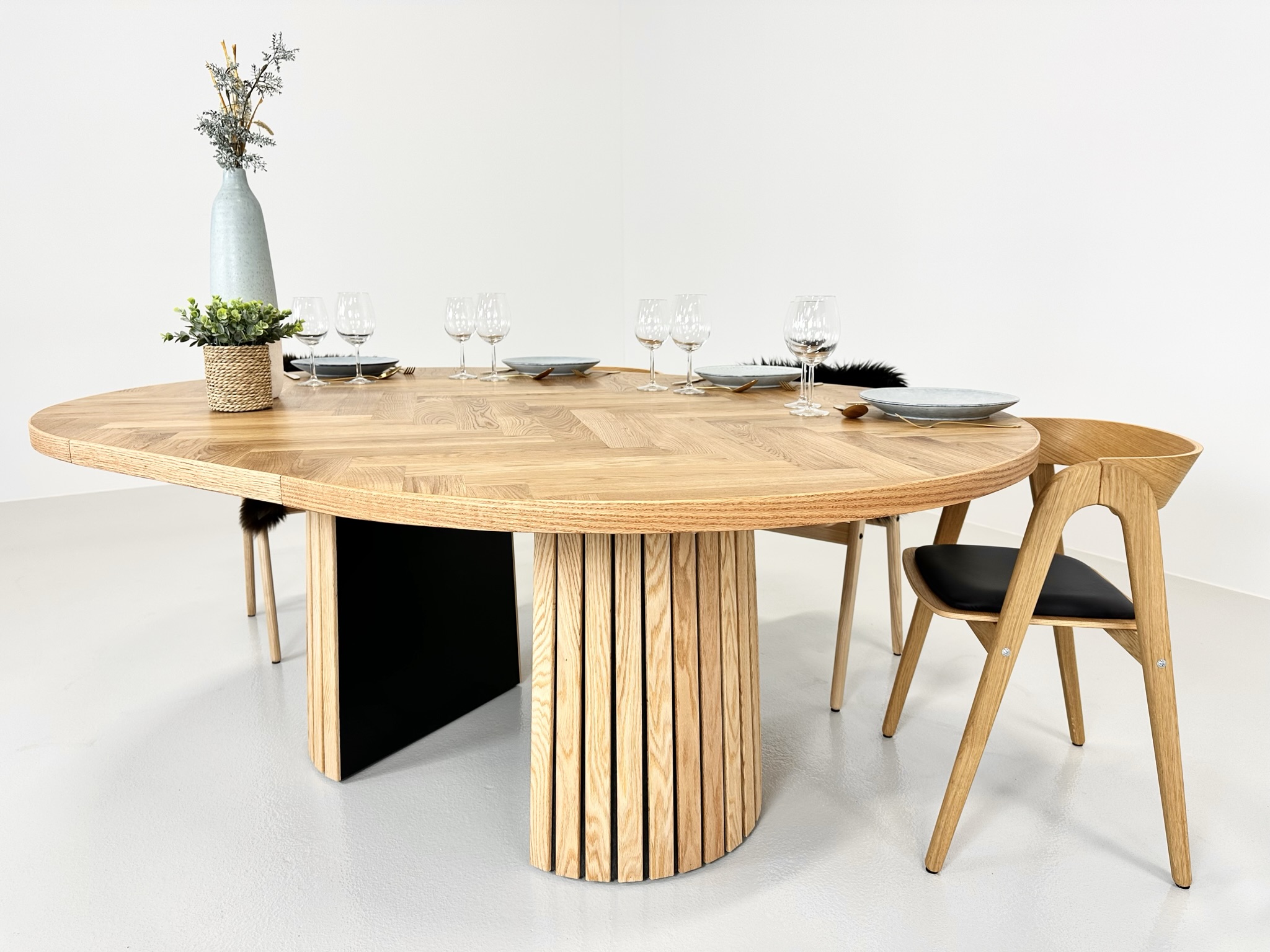 Et rundt fiskebensbord med skjult udtræk til tillægsplader er den perfekte kombination af æstetik, funktionalitet og fleksibilitet, der løfter ethvert rum til nye højder af elegance og praktisk anvendelighed.