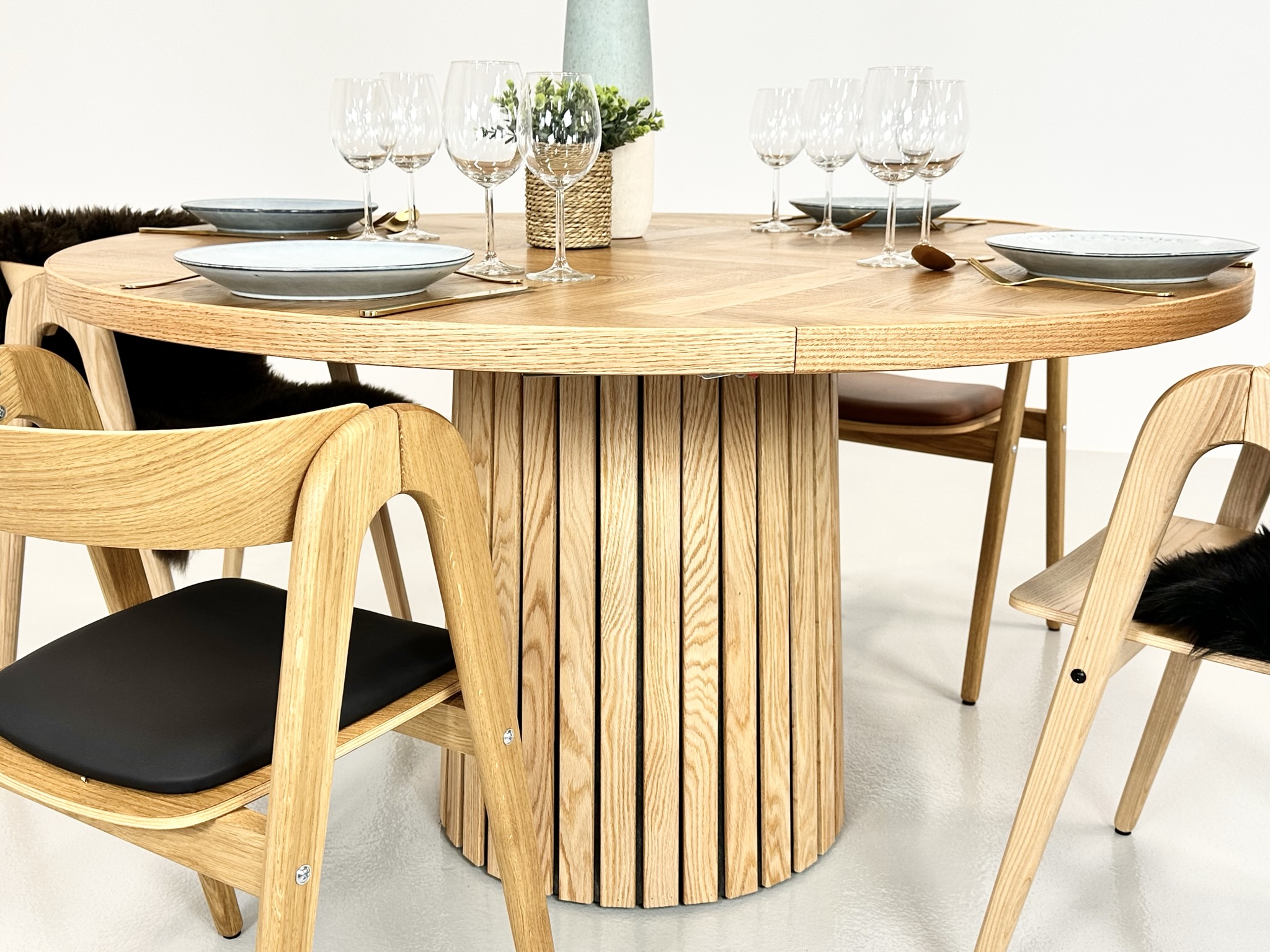Rundt sildebensbord med udtræk til 1 stk tillægsplade – Ø140 cm