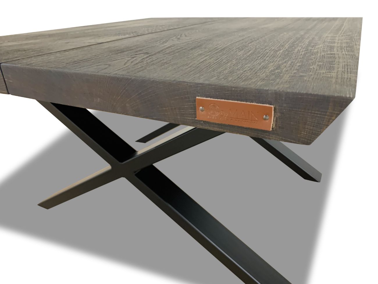 Stel af X-ben som er udformet i 6×3 cm profil. Benene monteres via de nedfræste skruehuller med umbraco-skruemontering. Der medfølger justeringsskrue i bunden af hver bordben. Således vil bordet med fordel kunne justeres ind.