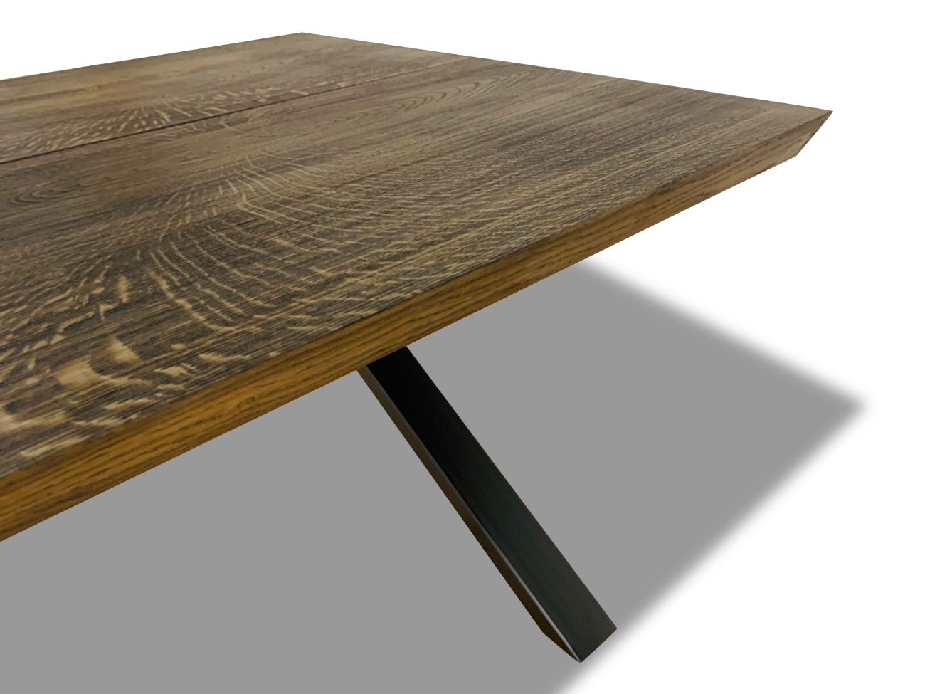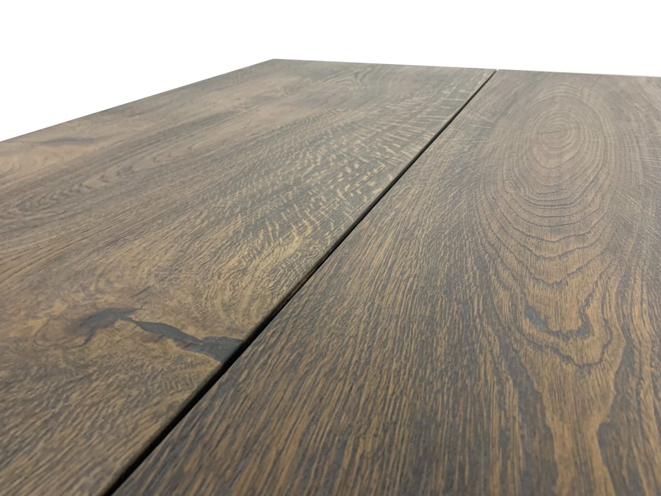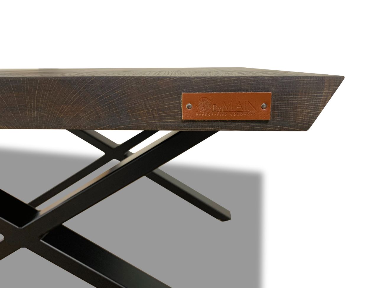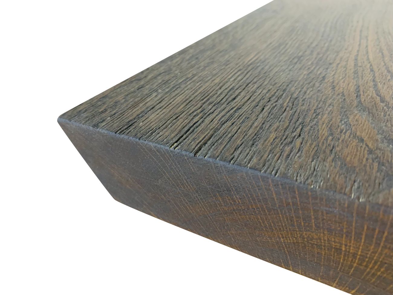 2 massive HELE ovntørrede egetræsplanker, som er monteret med tværliggende skjulte metalafstivere.