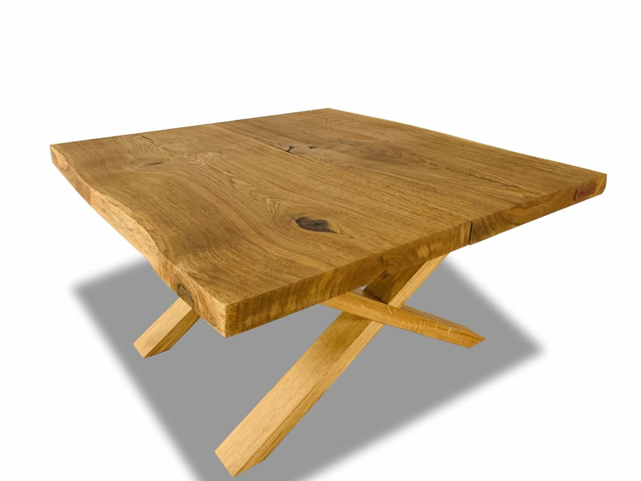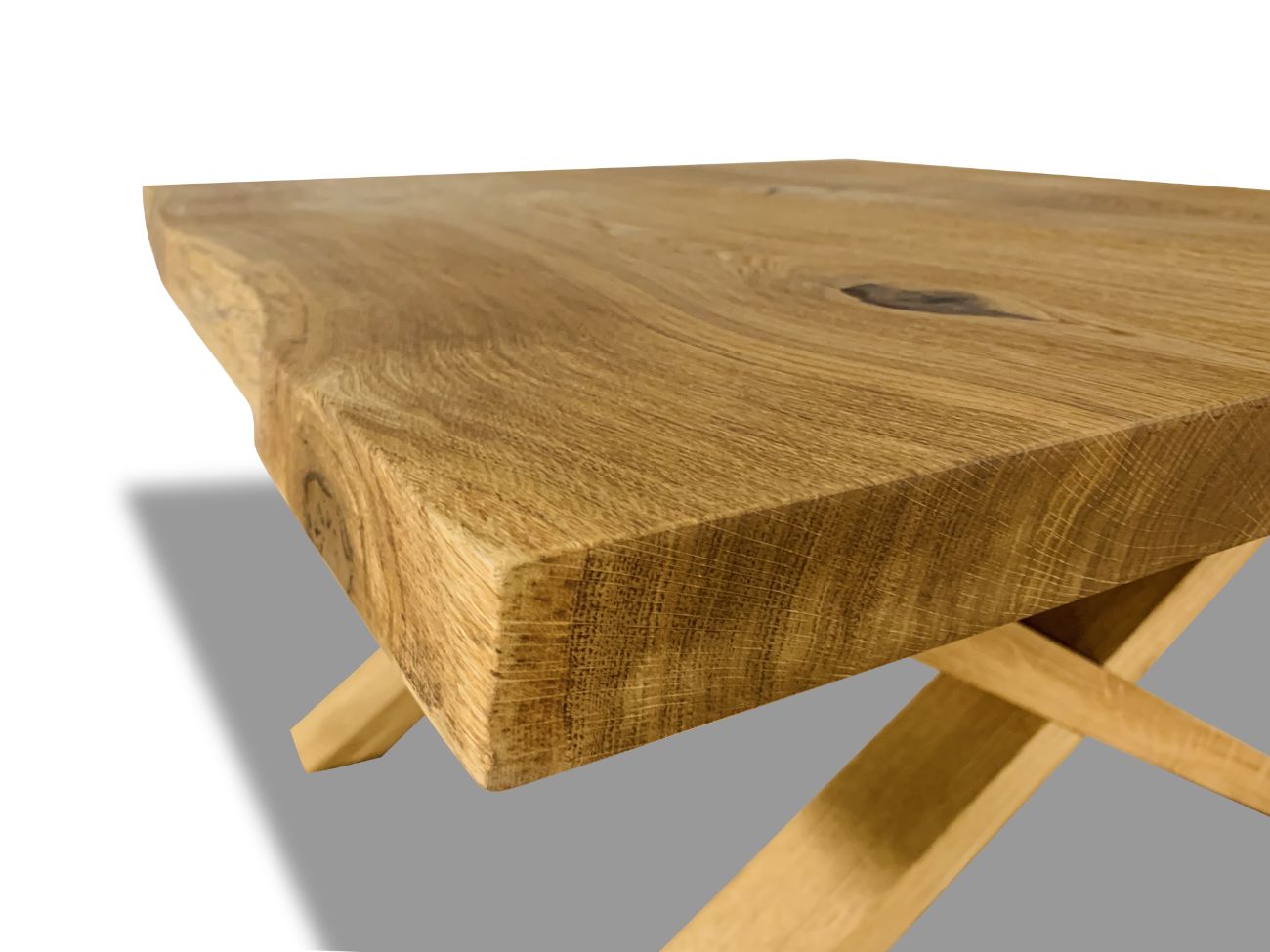 Sofabord med træben i 2 hele massive egeplanker behandlet med transparent ophærdet olie fra Rubio Monocoat. Overfladen er “børstet” for ekstra rustik look. Sofabordet måler 90 cm x 85-90 cm.